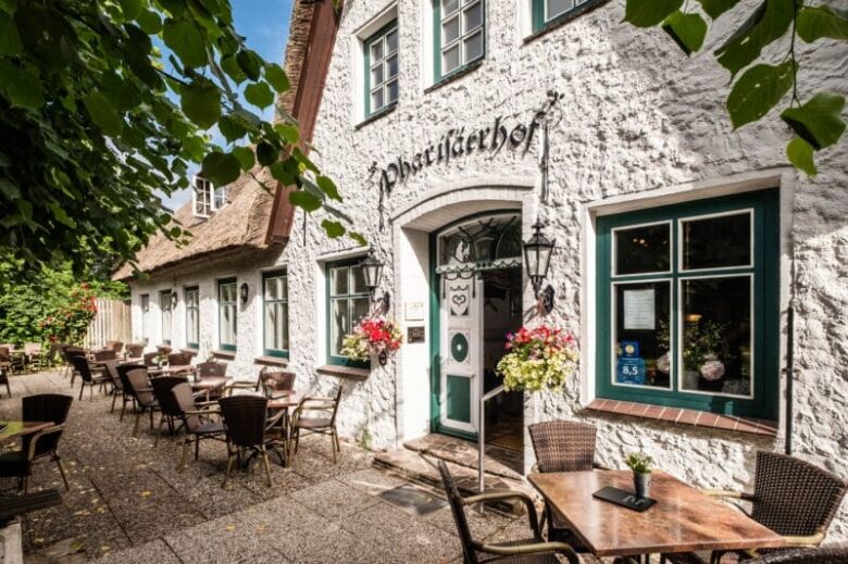 Das „Café mit Schwips“ auf dem Pharisäerhof zählt zu den schönsten und interessantesten Cafés in Nordfriesland. Der Gastraum des Cafés ist mit alten Kachelöfen, Kamin und vielen antiken, friesischen Möbelstücken eingerichtet. Auf der Speisekarte stehen ausschließlich hausgebackene Kuchen, leckere Torten und selbstgemachtes Eis. Im Hofladen werden typische Nordstrander Köstlichkeiten, Kunsthandwerk. Souvenirs, Geschenke oder Erinnerungsstücke verkauft.